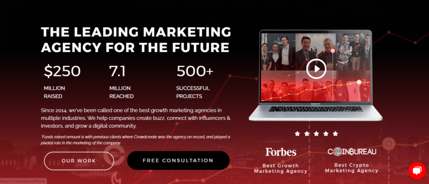 Crowdcreate คือ บริษัทเอเจนซี่ด้านการตลาดที่เป็นที่รู้จักกันดี ในเรื่องการเชื่อมโยงโปรเจกต์กับอินฟลูเอนเซอร์และนักลงทุนชั้นนำเข้าด้วยกัน Crowdcreate นำเสนอโซลูชั่นด้านการตลาดและการพัฒนา NFT, โอกาสในการสร้างเครือข่ายวีไอพี, และการจัดการคอมมูนิตี้สำหรับแบรนด์บล็อกเชน