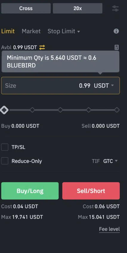 คุณสามารถตั้งค่า Limit Order และส่งคำสั่งได้ จากที่ได้กล่าวไว้ มูลค่าคำสั่งขั้นต่ำคือ 0.6 BLUEBIRD หรือ 5.640 USDT