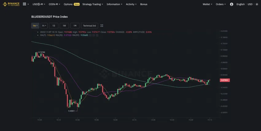 คุณสามารถใช้มันเป็น Crypto Index เพื่อดูการเติบโตของทั้ง 3 องค์ประกอบปัจจุบัน เพื่อที่จะเข้าถึงมัน คุณเพียงแค่ต้องค้นหาสัญลักษณ์ BLUEBIRDUSDT ในหน้าดัชนี USD-M