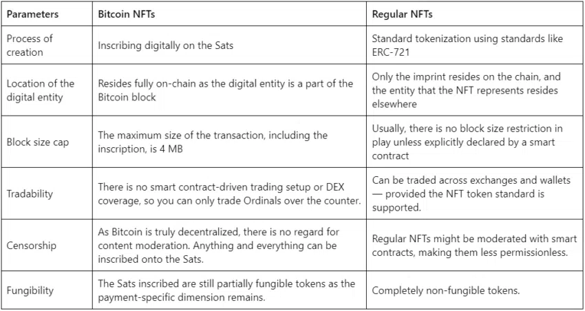 Bitcoin NFT นั้นไม่เหมือนกับ NFT ทั่วไปที่เราพบเห็นได้บนตลาดซื้อขาย NFT ยอดนิยมบน Ethereum ถึงอย่างไรก็ตาม มันก็เหมาะสมที่จะเปรียบเทียบ Bitcoin NFTs หรือ Ordinals กับ NFTs ทั่วไป และนี่คือตารางข้อมูลที่อาจจะช่วยได้