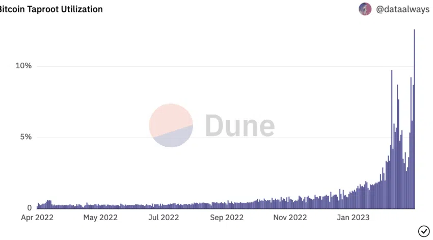 Ordinals ยังได้ช่วยเพิ่มยอดการใช้งาน Taproot เนื่องจากโปรโตคอลนี้เป็นสิ่งที่ช่วยอำนวยความสะดวกในการ Inscription (ฝังข้อมูล) ให้กับ Bitcoin NFTs