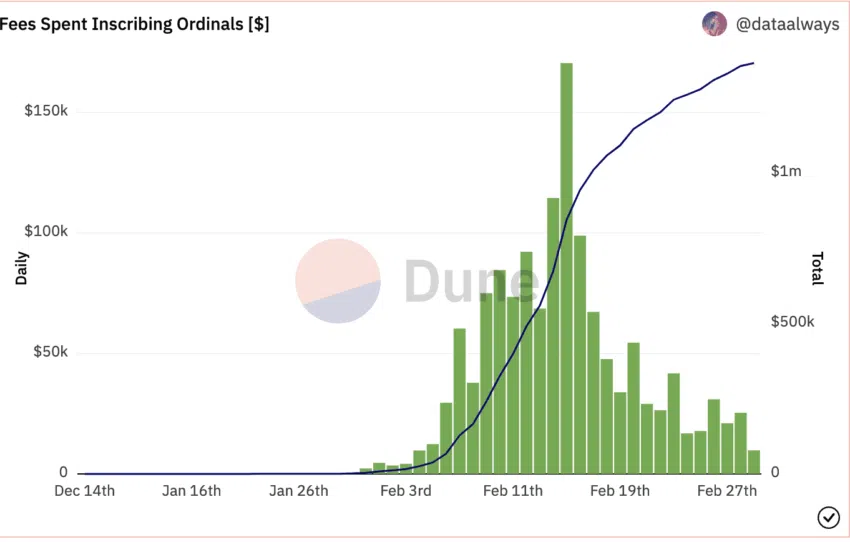 นอกเหนือจากเรื่องค่าธรรมเนียมเครือข่ายที่เพิ่มขึ้นจนถึงวันที่ 15 กุมภาพันธ์ 2023 ค่าใช้จ่ายในฝังข้อมูล Bitcoin NFT นั้นยังคงที่ ในช่วงสัปดาห์ที่ผ่านมา (ณ วันที่ 1 มีนาคม 2023) ดูเหมือนว่าความนิยมนั้นจะลดลง ซึ่งเหตุผลอาจจะเป็นเพราะว่าผู้ใช้งานดูข้อความมากกว่ารูปภาพหรือกระทั่งเลือกช่วงเวลา(ในการทำธุรกรรม)ที่ยาวนานขึ้น