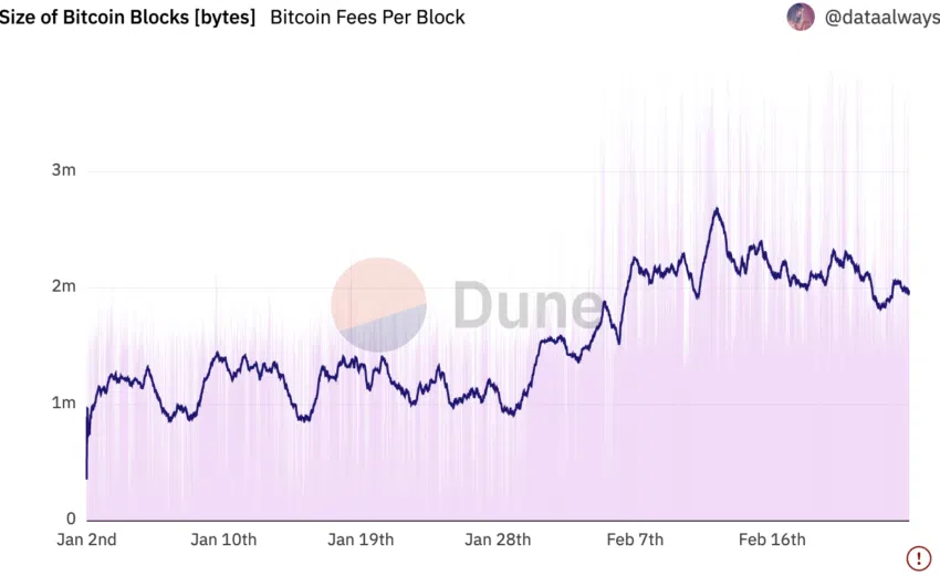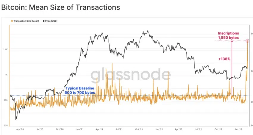 นอกจากนี้ ลองดูสิว่าขนาดโดยเฉลี่ยของบล็อกและธุรกรรมเพิ่มขึ้นมาเพียงใดหลังจากการเปิดตัว Bitcoin NFTs