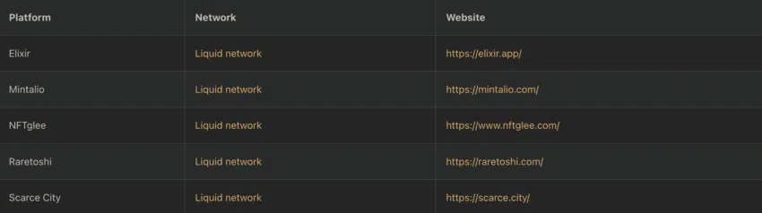 และนี่คือรายชื่อของแพลตฟอร์ม NFT บน Liquid Network