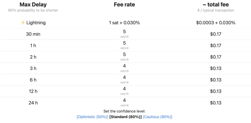 ตอนนี้ มาดูกันที่การประเมินค่าธรรมเนียมของ Bitcoin ธุรกรรมมาตรฐานพร้อมดีเลย์ 1 ชั่วโมงจะมีอัตราค่าธรรมเนียมที่ 5 Sat/vB หรือ 0.17 ดอลลาร์ (ซึ่งอาจจะเปลี่ยนแปลงได้ในอนาคต)
