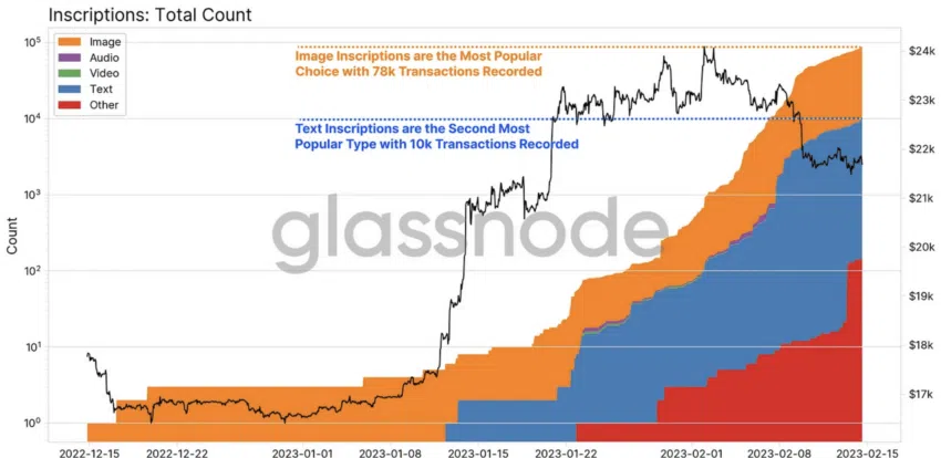 ชาร์ตด้านล่างแสดงให้เห็นถึงการแท็กไฟล์ดิจิทัลกับ Sats มาจนถึงวันที่ 15 กุมภาพันธ์ 2023 จะสังเกตเห็นได้ว่าผู้ใช้งานเริ่มจากการเพิ่มรูปภาพ แต่หลังจากนั้นไม่นานก็เริ่มที่จะเพิ่มข้อความเข้ามาเช่นกัน ซึ่งอาจจะเป็นเพราะต้นทุนการทำธุรกรรมและความล่าช้าที่เพิ่มมากขึ้น