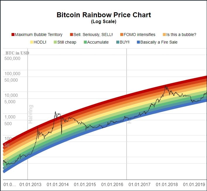 มันอาจจะถูกเรียกในอีกชื่อว่า BTC Rainbow Chart เครื่องมือที่เป็นมิตรต่อนักลงทุนนี้ประกอบไปด้วยความเคลื่อนไหวของราคาในอดีต, แถบสีที่มีสีสัน, และความอดทนต่อความผันผวนเป็นศูนย์ เราอาจจะพูดเกินจริงไปบ้าง แต่อย่างไรก็ตาม Bitcoin Rainbow Chart (แผนภูมิสายรุ้งของบิตคอยน์) แสดงให้เห็นถึงราคา BTC ที่ไม่มีการเจือปน — ทำให้ความผันผวนรายวันไม่มีการปะปนกัน และยังใช้แบบจำลองทางสถิติ — เพื่อเพิ่มความน่าเชื่อถือในฐานะเครื่องมือในการประเมินราคา Bitcoin ที่เชื่อถือได้