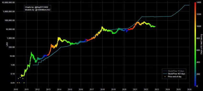 Bitcoin Stock-to-Flow Chart เป็นอีกหนึ่งตัวชี้วัดการคาดการณ์ราคาที่เชื่อถือได้ อย่างไรก็ตาม มันแตกต่างจาก Rainbow Chart ในส่วนที่สำคัญบางประการ ในขณะที่ Rainbow Chart จะพิจารณาราคาในอดีตและการถดถอยแบบลอการิทึมเพื่อกำหนดโซนมูลค่าที่เหมาะสมสำหรับราคาเหล่านั้น Stock-to-Flow Model จะนำราคาและความขาดแคลนของ BTC มาคำนวน