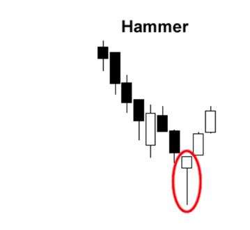 Hammer เป็นรูปแบบของแท่งเทียนเดี่ยวที่อยู่ที่จุดล่างสุดของเทรนด์ขาลง โดยจะมีขนาดแท่งเทียนที่สั้น และ มีไส้เทียนด้านล่างที่ยาว ทำให้มันมีรูปร่างเหมือน “ค้อน” ที่ตั้งตรงอยู่ Hammer เป็นรูปแบบของการกลับตัว ซึ่งบ่งบอกว่าผู้ซื้อเริ่มสร้างความกดดันต่อแรงขาย และราคาสินทรัพย์อาจจะเริ่มไต่ขึ้นได้อีกครั้ง