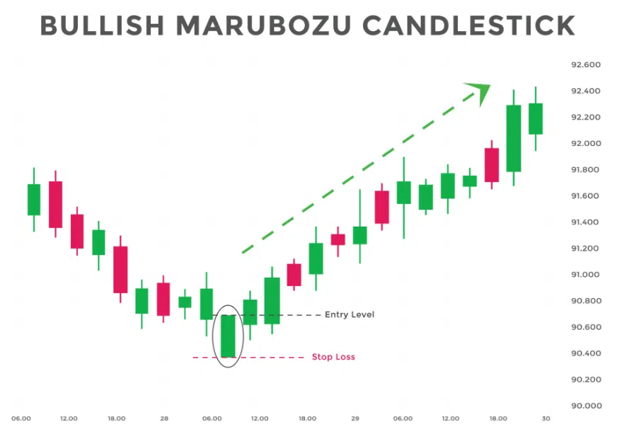 รูปแบบ Bullish Marubozu เป็นการส่งสัญญาณว่าผู้ซื้ออยู่ในการควบคุมระหว่างการก่อตัวของแท่งเทียน ราคาของมันเปิดที่จุดต่ำสุดและปิดที่จุดสูงสุด นักเทรดมักจะไม่ค่อยได้เห็น Bullish Marubozu ด้วยตัวมันเอง ดังนั้น มันจึงมีโอกาสที่จะเป็นขาขึ้นอย่างมากเมื่อรูปแบบนี้ปรากฏขึ้น