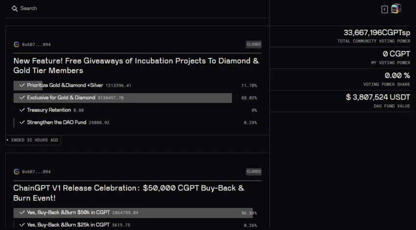 - มีส่วนร่วมใน DAO: สมาชิกของชุมชนและผู้ถือโทเค็น $CGPT สามารถมีส่วนร่วมใน DAO ได้ พวกเขาสามารถเสนอแนะและลงคะแนนให้กับไอเดียต่างๆ ตัดสินใจว่าจะใช้กองทุน DAO อย่างไร และตัดสินใจเกี่ยวกับทิศทางของการพัฒนาในอนาคตของระบบนิเวศได้