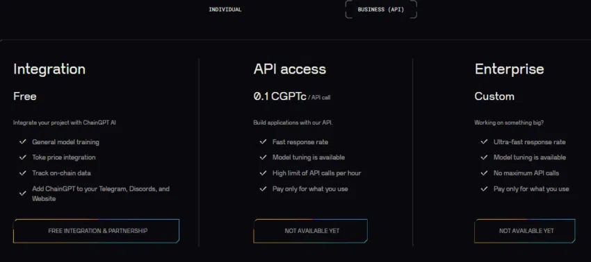 สำหรับตัวเลือกอื่นๆ แผน API Access จะช่วยให้สามารถผสานรวมได้เช่นกัน นอกจากนี้ ChainGPT ยังมีแผน Enterprise Custom สำหรับผู้ที่ทำงานอยู่ในโปรเจกต์ที่สำคัญอีกด้วย อย่างไรก็ตาม ในปัจจุบัน ตัวเลือก 2 ตัวนี้ยังไม่มีการเปิดให้บริการต่อสาธารณะ