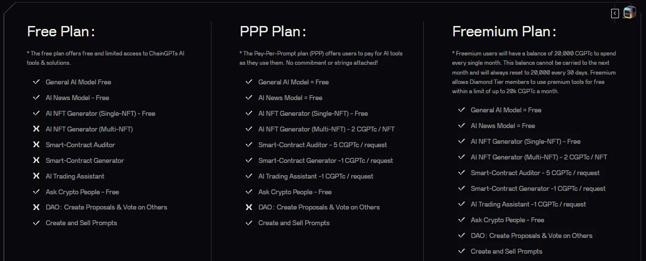 เครื่องสร้าง NFT แบบพร้อมกันหลายตัว, ตัวตรวจสอบ Smart Contract, ตัวสร้าง Smart Contract, และผู้ช่วยทำการซื้อขายด้วย AI นั้นมีให้ใช้งานอยู่ในแผน PPP ส่วนแผน Freemium จะมอบโทเค็น $CGPT เป็นจำนวน 20,000 โทเค็นให้แก่ผู้ใช้งานเป็นรายเดือน โดยจะมีการรีเซตยอดคงเหลือทุกๆ 30 วัน และไม่สามารถยกยอดไปต่อได้