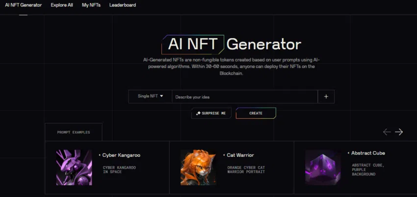 - เครื่องสร้าง NFT ด้วย AI: ผู้ใช้งานสามารถสร้าง Non-Fungible Tokens (NFTs) ที่มีเอกลักษณ์ไม่ซ้ำใครได้ด้วยการใช้อัลกอริธึมที่สร้างโดย AI ซึ่งจะเหมาะสำหรับงานศิลปะ ไอเทมภายในเกม และของสะสมในรูปแบบดิจิทัล ในการสร้าง NFT เหล่านี้บนบล็อกเชนจะใช้เวลาเพียง 30-60 วินาทีเท่านั้น