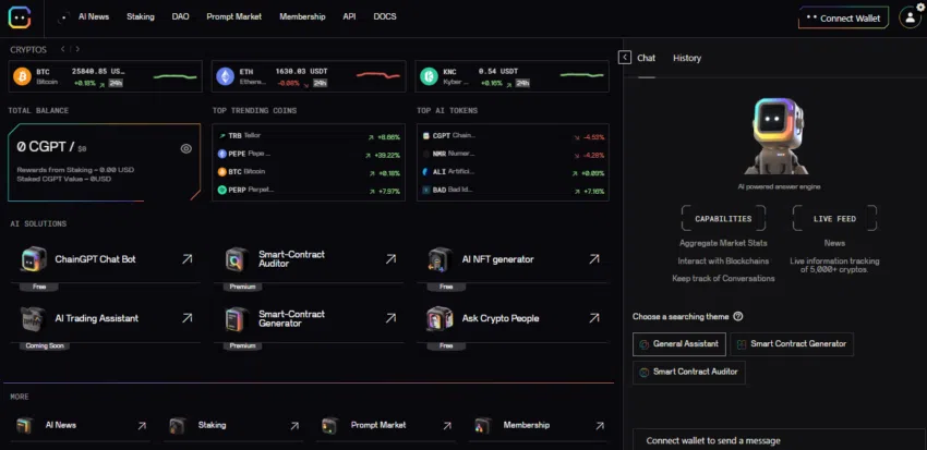 - ผู้ช่วยแชทบอท AI: ผู้ช่วย AI ที่สามารถสนทนาโต้ตอบได้ของ ChainGPT จะช่วยบุคคลทั่วไป นักพัฒนา และธุรกิจในการทำงานต่างๆ ได้ เช่น การเขียนโปรแกรม Smart Contract โดยไม่ต้องใช้โค้ด, แก้ไขจุดบกพร่อง, วิเคราะห์ตลาด, ทำการซื้อขาย และอื่นๆ อีกมากมาย ขณะนี้ ตัวโปรแกรมเวอร์ชั่นเบต้าสามารถใช้งานได้ฟรีอีกด้วย