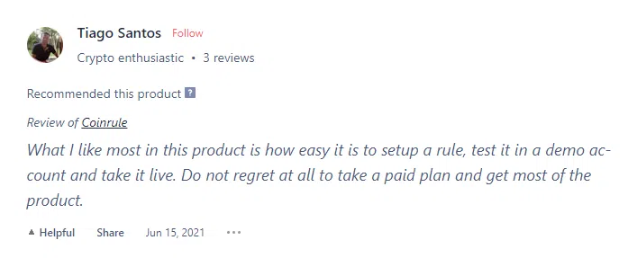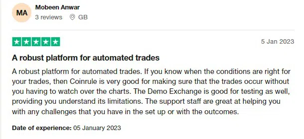 อย่างไรก็ตาม บน TrustPilot เองก็ยังมีผู้ใช้งานบางส่วนที่ได้แสดงความคิดเห็นเชิงบวกเกี่ยวกับการบริการลูกค้าที่รวดเร็วและเป็นประโยชน์ ผู้ใช้งานบางคนชื่นชมทีมงานซัพพอร์ตของ Coinrule สำหรับการตอบกลับที่รวดเร็ว ความมีน้ำใจ และความช่วยเหลือในการแก้ไขปัญหาที่มีประสิทธิภาพ พวกเขาอธิบายว่า การให้บริการลูกค้าของ Coinrule นั้น “รวดเร็ว” และ “ยอดเยี่ยมมาก”