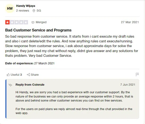 ผู้ใช้งานหลายคนแสดงให้เห็นถึงความไม่พอใจกับประสบการณ์การบริการลูกค้าของ Coinrule โดยระบุถึงปัญหาต่างๆ เช่น การตอบกลับที่ช้าจนเกินไป การไม่ตอบคำถามที่เฉพาะเจาะจง และขาดวิธีการแก้ไขปัญหาทางเทคนิคอย่างเหมาะสม