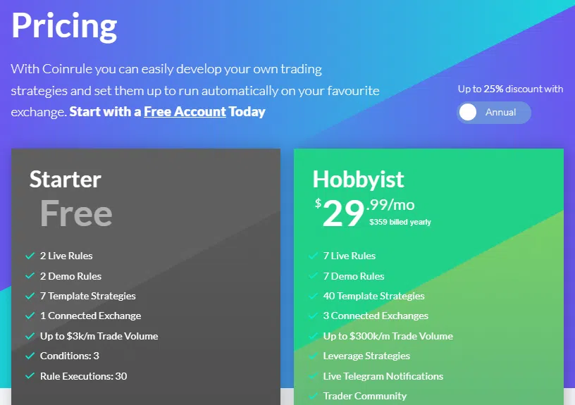 Coinrule มีราคาค่าบริการที่หลากหลายระดับเพื่อรองรับต่อผู้ใช้งานที่แตกต่างกัน หากคุณเลือกชำระเงินเป็นรายปีหรือรายเดือน คุณก็จะได้รับส่วนลดในแต่ละแผนด้วยเช่นกัน