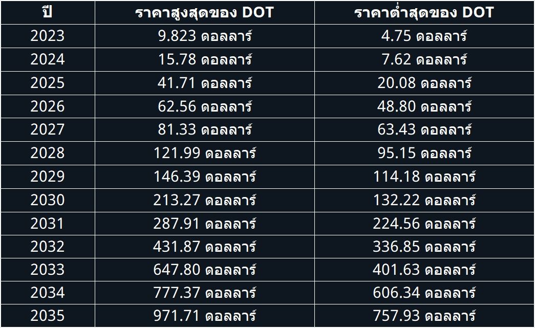ข้อมูลด้านล่างคือตารางการคาดการณ์ราคา Polkadot (DOT) ในระยะยาวไปจนถึงปี 2035: