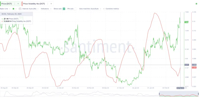 กราฟความผันผวนแสดงให้เห็นถึงจุดต่ำสุดใหม่ในขณะที่ราคาพุ่งขึ้นไป สอดคล้องกับข้อมูลในอดีตที่บ่งบอกว่าราคาของ DOT จะขยับขึ้น ถึงแม้ว่าจะผ่านช่วงเวลาแห่งความผันผวนไปแล้ว 2-3 วันหรือหลายสัปดาห์ ซึ่งนี่อาจจะเป็นการบอกใบ้ถึงความเคลื่อนไหวขาขึ้นของราคา DOT ในระยะสั้นได้