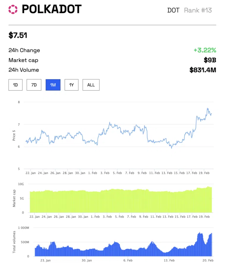 กราฟราคา DOT, มูลค่าตลาด, ปริมาณการซื้อขาย ได้แสดงให้เราเห็นถึงแนวโน้มที่น่าสนใจ ณ วันที่ 20 กุมภาพันธ์ 2023 ความเคลื่อนไหวของราคาเป็นไปในเชิงบวกเนื่องจากปริมาณการซื้อขายเพิ่มขึ้นอย่างต่อเนื่องในช่วง 2 สัปดาห์ที่ผ่านมา ยิ่งไปกว่านั้น ปริมาณการซื้อขายที่เพิ่มขึ้นนี้ยังหมายความว่าความผันผวนของ DOT นั้นอาจจะลดลง ซึ่งจะเป็นข่าวที่ทำให้ผู้ถือครอง DOT อยู่พึงพอใจ
