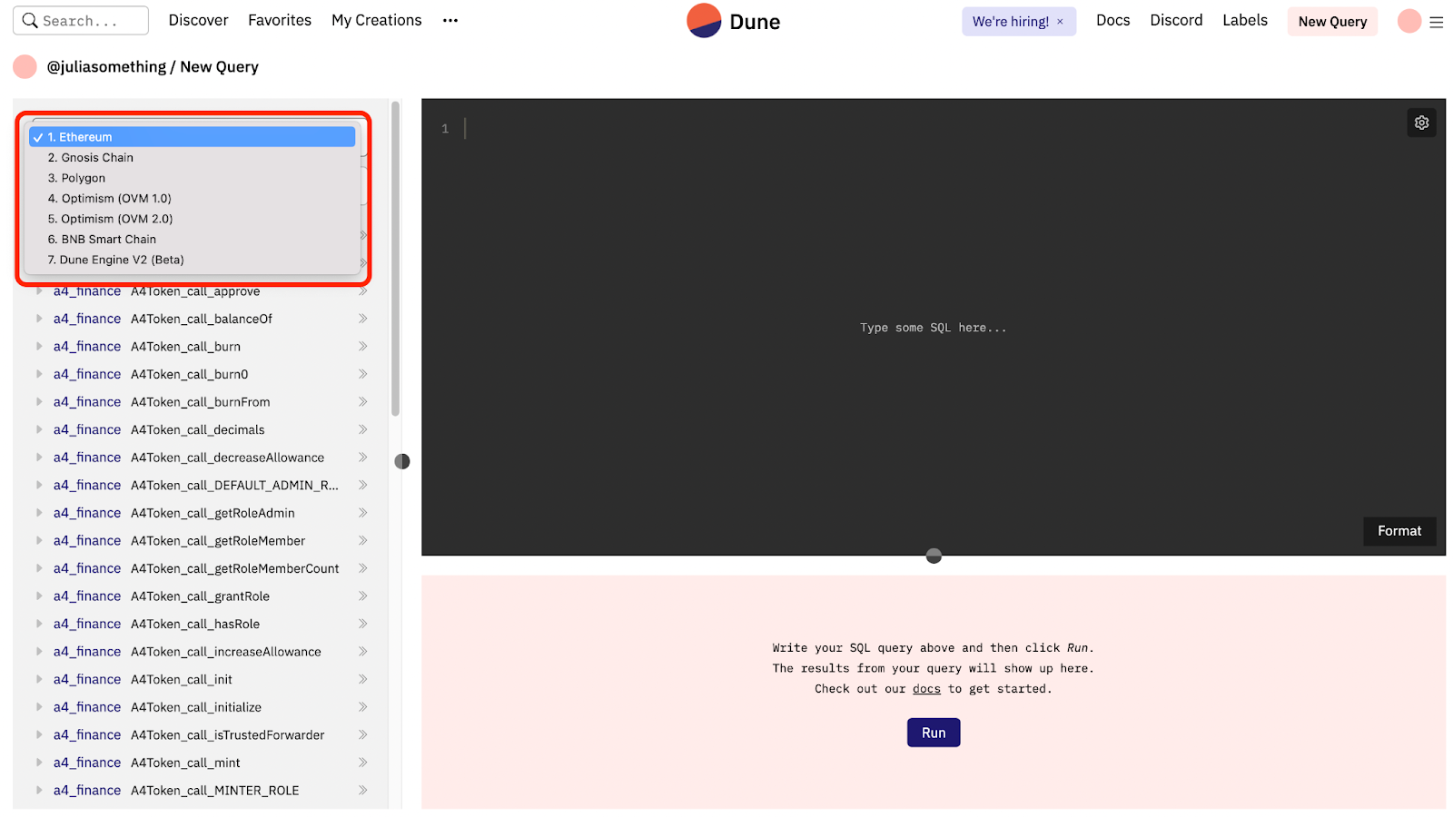 ประการแรก คุณต้องเลือกฐานข้อมูลสำหรับการสืบค้นของคุณ (Ethereum, Gnosis Chain, Polygon, Optimism OBM 1.0, Optimism OVM 2.0, BNB Smart Chain และ Dune Engine V2)