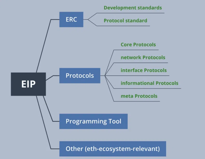 การปรับปรุงและเปลี่ยนแปลงในเชิงเทคนิคต่างๆ ที่ถูกเสนอต่อระบบนิเวศของ Ethereum จะเริ่มต้นมาจากการเป็น EIP หรือ Ethereum Improvement Proposal เมื่อระบบกำกับดูแลของเครือข่ายให้การยอมรับ, อนุญาต และยืนยันเรื่องการเปลี่ยนแปลงแล้ว มันก็จะกลายมาเป็น ERC หรือ Ethereum Request for Comment