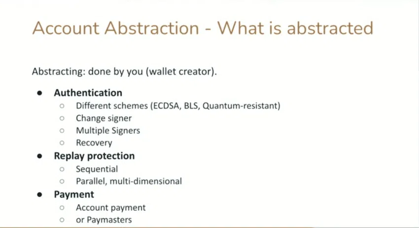 Abstraction คือ แนวคิดหรือคอนเซปต์ ซึ่งว่าด้วย EIP-4337 หรือที่ปัจจุบันก็คือ ERC-4337 ของ Ethereum ที่วางแผนในการนำแนวคิดใหม่ ๆ มาสู่ “บัญชีผู้ใช้งาน” (User Accounts) ซึ่งอาจจะหมายถึงการถอนหรือลบบางสิ่งออกไป เพื่อทำให้ผู้ใช้งานสามารถขจัดคุณสมบัติในการจัดการบัญชีผู้ใช้งานแบบเก่า (อย่างเช่น MetaMask) ที่ไม่ต้องการออกไปได้ — เช่น การโฟกัสในเรื่อง Seed Phrases การที่จะต้องเซ็นชื่อธุรกรรมในแต่ละรายการแยกกัน หรือการพึ่งพาคีย์ส่วนตัวมากจนเกินไป