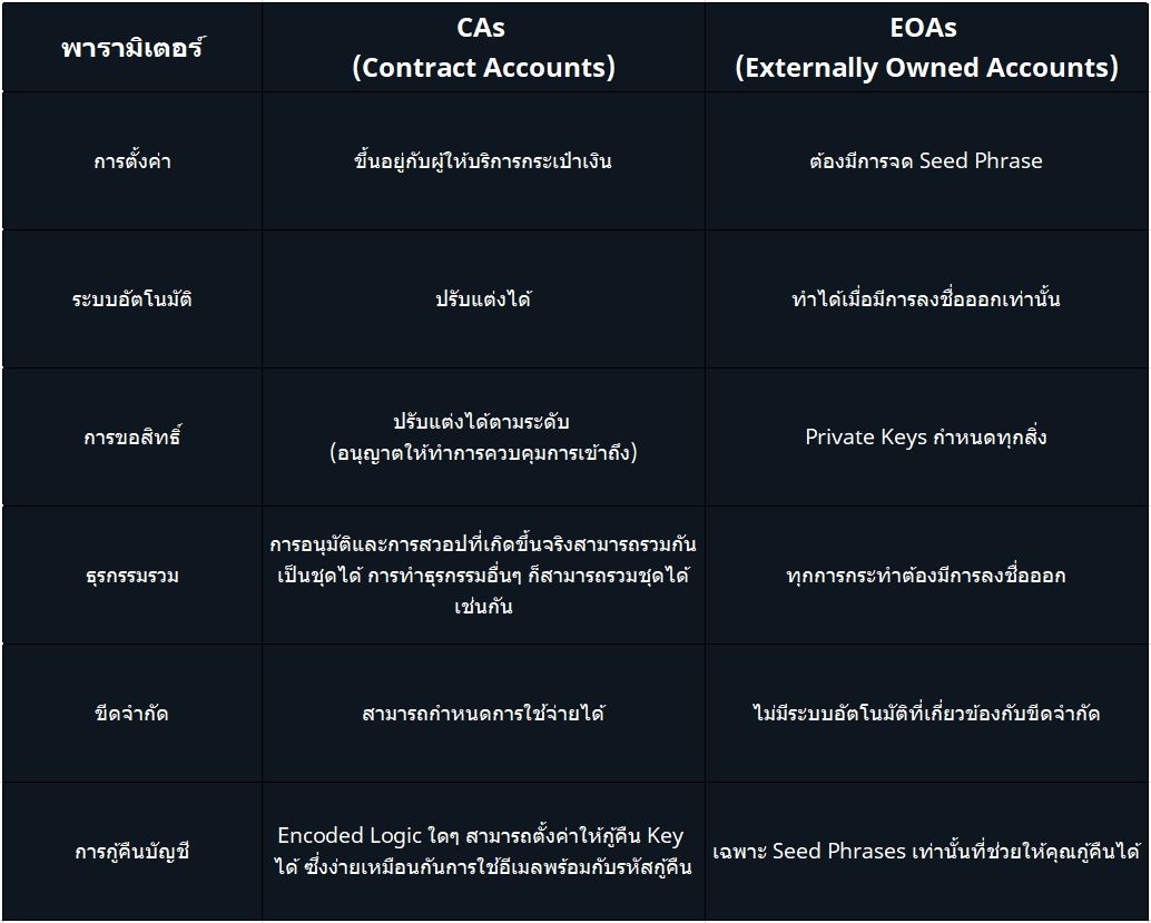 และนี่คือข้อเปรียบเทียบบางส่วนระหว่าง CAs (Contract Accounts) กับ EOAs (Externally Owned Accounts):