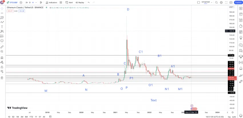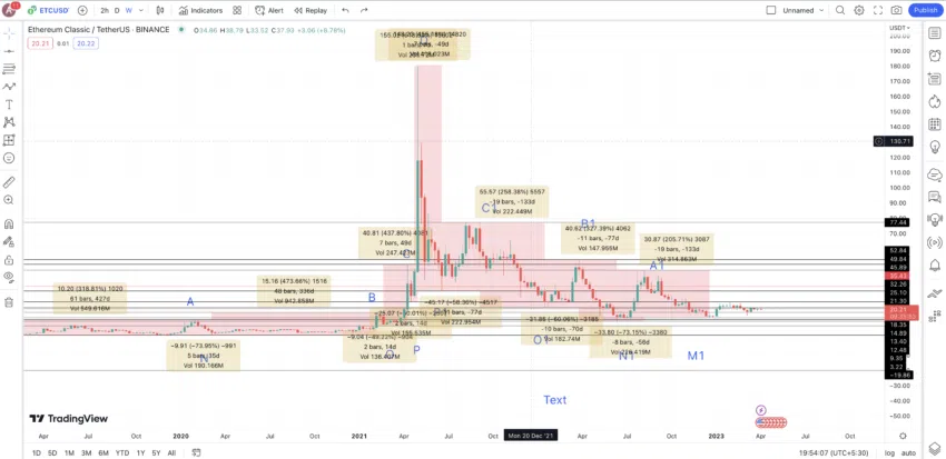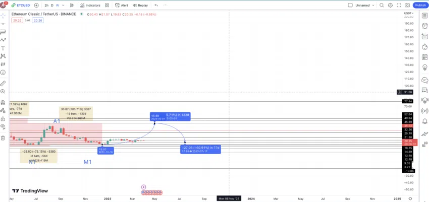 นั่นจะทำให้จุด A2 อยู่ที่ระดับ 45.88 ดอลลาร์ ใน 133 วัน ซึ่งเป็นช่วงระยะเวลาที่พบได้ถึง 2 ครั้งจากตารางข้อมูลก่อนหน้า จุดต่ำสุดถัดไป (จุด N2) อาจจะเป็นการลดลงที่ -60.79% ใน 77 วัน ซึ่งจะทำให้ราคาของ ETC ที่คาดการณ์ไว้อยู่ที่ 17.93 ดอลลาร์ ในช่วงเดือนกรกฎาคม 2023