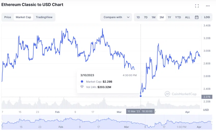 ในวันที่ 6 เมษายน 2023 ราคาของ ETC ซึ่งเป็นเหรียญของเครือข่าย Ethereum Classic เพิ่มขึ้นมากกว่า 6% เมื่อเทียบเดือนต่อเดือน และการเพิ่มขึ้นของราคาในครั้งนี้ เป็นมากกว่าแค่การพุ่งขึ้นในช่วงสั้น ๆ สำหรับใครที่อาจจะยังไม่ทราบ Ethereum Classic นั้นเป็นเชนที่เป็น hard-fork ของ Ethereum ที่ยังคงรักษาคุณลักษณะดั้งเดิมของโปรโตคอลก่อนที่จะเกิดการแฮ็ก DAO ขึ้นในปี 2016 เอาไว้ ถึงแม้ว่ามันจะไม่ได้รับความนิยมเช่นเดียวกับ Ethereum แต่ Ethereum Classic ก็ยังคงเป็นเชนสำหรับ DApp และ Smart Contract ที่น่าเชื่อถือ ซึ่งยังคงเป็นเครือข่าย Proof-of-Work