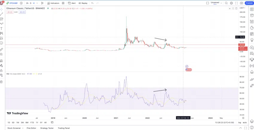 ด้านล่างนี้คือกราฟรายสัปดาห์ ซึ่งสามารถเห็นราคาสูงสุดตลอดกาลของ ETC ที่อยู่ใกล้ๆ กับระดับ 177 ดอลลาร์ได้อย่างชัดเจน ที่ด้านซ้ายของจุดสูงสุด เรามีชุดของจุดสูงที่สูงขึ้น ในขณะที่ด้านขวาประกอบไปด้วยจุดสูงที่ต่ำลง และจะเห็นได้ถึงสัญญาณ RSI Bullish Divergence รายสัปดาห์ที่กำลังก่อตัว นี่อาจจะเป็นการบอกใบ้ถึงการเกิดขึ้นของรูปแบบใหม่ โดยชุดของจุดสูงที่ต่ำลงอาจจะถูกขัดขวางโดยจุดสูงที่สูงขึ้น