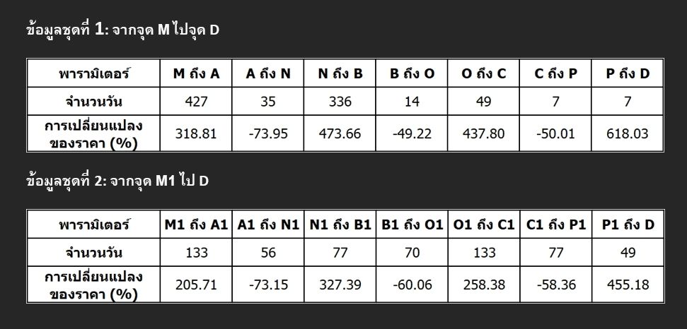 เพื่อคำนวณหาเปอร์เซ็นต์ค่าเฉลี่ยของจุดต่ำไปสูงและจุดสูงไปต่ำ เราจะต้องระบุข้อมูลของความเคลื่อนไหว (การเปลี่ยนแปลงของราคาและช่วงระยะเวลา) ของจุดต่ำและจุดสูงทั้งหมดในทั้ง 2 เส้นทาง ได้แก่ จากจุด M ไปจุด D และจุด M1 ไปจุด D