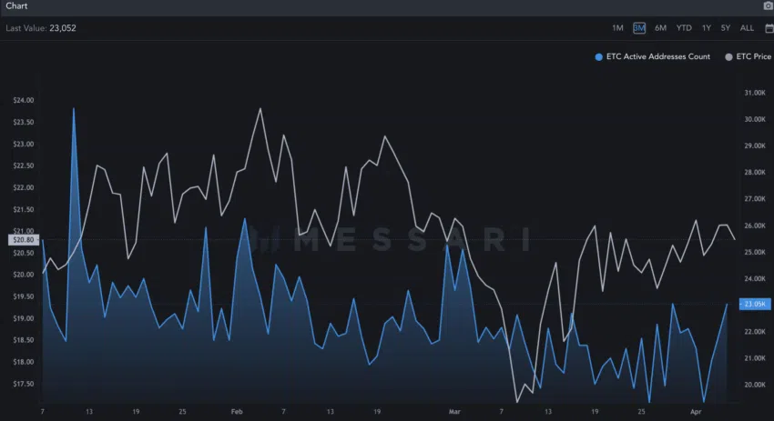 หากดูที่จำนวน Address ในรอบ 90 วันของ ETC จะเห็นได้ว่าลดลงเป็นอย่างมาก โดยในวันที่ 11 มกราคม 2023 จำนวน Address พุ่งขึ้นไปอยู่จุดสูงสุด แล้วตามมาด้วยราคาของ Ethereum Classic ที่พุ่งสูงขึ้น อย่างไรก็ตาม ตั้งแต่นั้นเป็นต้นมา จำนวน Address ก็เริ่มลดลง และส่งผลให้ราคาลดลงเป็นอย่างมากในวันที่ 9 มีนาคม 2023 เราแนะนำให้ลองจับตามองจำนวน Active Address (ที่อยู่ของกระเป๋าเงินที่มีความเคลื่อนไหวในช่วงระยะเวลาที่กำหนด) อย่างใกล้ชิด เพื่อเตรียมพร้อมสำหรับโอกาสที่ราคาจะพุ่งสูงขึ้น