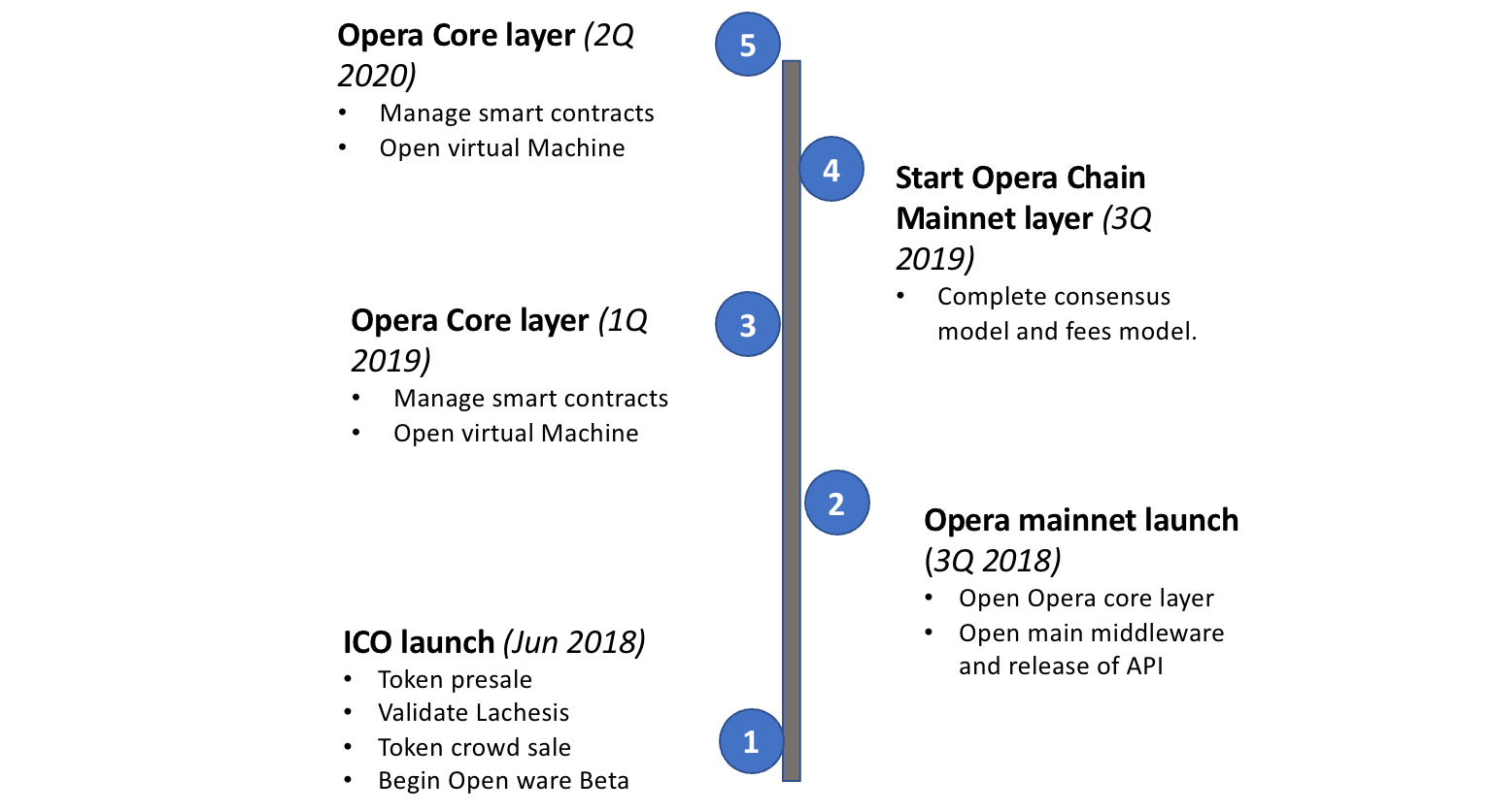 เพื่อให้สอดคล้องกับเอกสารไวท์เปเปอร์ แพลตฟอร์มนี้มีขั้นที่สำคัญ 5 ขั้น ได้แก่ ขั้น Intermezzo, ขั้น Seria, ขั้น Buffa, ขั้น Opera และขั้น grand Opera