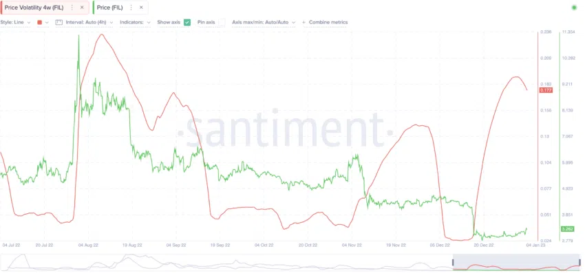 ความผันผวนของ FIL นั้นถึงไปจุดสูงสุดในช่วงต้นเดือนสิงหาคม 2022 หลังจากนั้น เราก็เห็นราคาลดลง หลังจากนั้นราคาก็ลดลงทุกครั้งที่ตัวชี้วัดความผันผวนไปถึงจุดสูงสุดที่ต่ำลง อย่างที่คุณได้เห็น ความผันผวนของ FIL กำลังเพิ่มขึ้น ซึ่งอาจจะทำให้ราคาลดลงในระยะสั้น