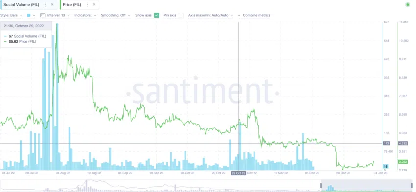 ปริมาณการพูดถึงในโลกโซเชี่ยลค่อนข้างสูงในช่วงเดือนสิงหาคม ราคาเองก็ตอบสนองในทำนองเดียวกัน ตั้งแต่นั้นมา ปริมาณการพูดถึงในโลกโซเชี่ยลของ FIL ก็ลดลงเรื่อยๆ โปรดสังเกตว่าปริมาณการพูดถึงในโลกโซเชี่ยลพุ่งขึ้นเล็กน้อยในช่วงปลายเดือนตุลาคม ซึ่งราคาก็แสดงให้เห็นถึงความแข็งแกร่งในช่วงเวลาดังกล่าว ดังนั้น มันจึงเป็นที่ชัดเจนว่าการพูดถึงในโลกโซเชี่ยลมีบทบาทสำคัญในการกำหนดราคาของ FIL