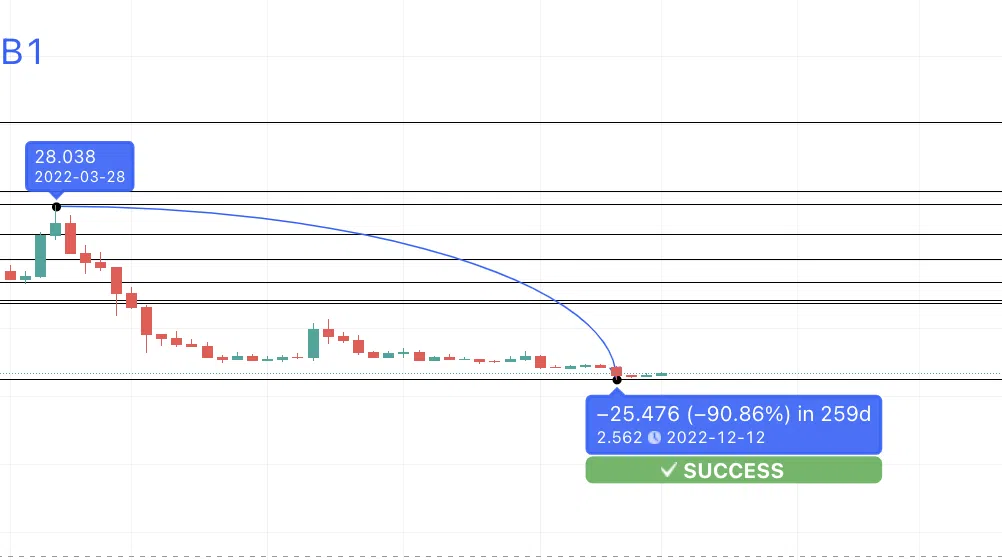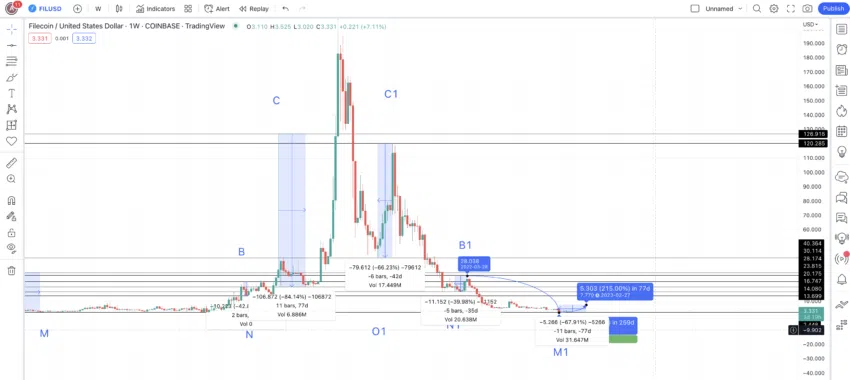 ดังนั้น จุดต่ำถัดไปหรือจุด M1 อาจจะอยู่ในช่วง 117 วันและลดลง 87.50% ให้เราดูว่าราคาของ FIL เคยแตะระดับดังกล่าวหรือไม่เมื่อวาดเส้นคาดการณ์จากจุด B1 การลดลงนั้นเกิดขึ้นอย่างช้าๆ และใช้เวลากว่า 259 วันกว่าที่ราคาของ Filecoin จะลดลงไป 90.86%