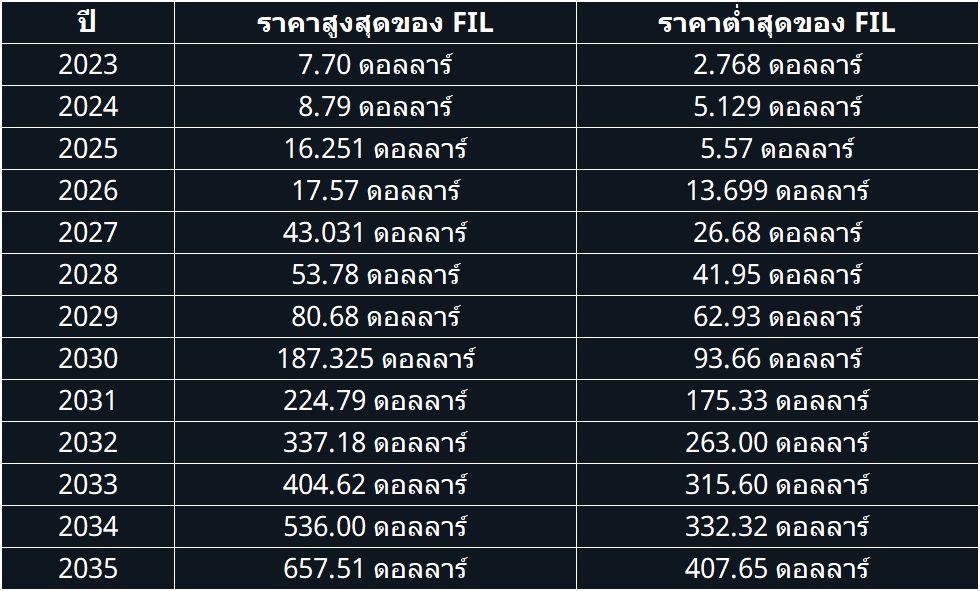 การคาดการณ์ราคา Filecoin (FIL) ในระยะยาว (สูงสุดถึงปี 2035)