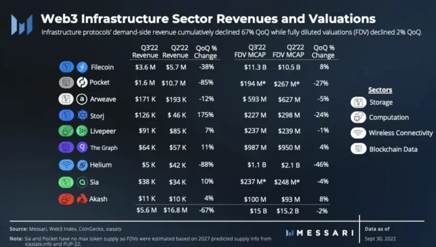 Filecoin เป็นหนึ่งในองค์ประกอบสำคัญของโครงสร้างพื้นฐาน Web3 หากเราเปรียบเทียบมันกับโปรโตคอลอื่นๆ เช่น Storj หรือแม้แต่ The Graph ดูเหมือนว่า Filecoin จะทำได้ดีกว่าในไตรมาสที่ 3 โดยเป็นสาเหตุอันเนื่องมากจาก FDV หรือ Fully Diluted Valuation ที่ 8% (มูลค่าตลาดของเหรียญหรือสินทรัพย์นั้นๆ โดยจะรวมมูลค่าของเหรียญที่ยังไม่ปลดล็อกด้วย)