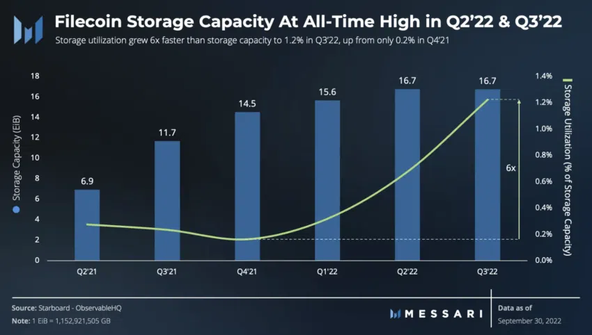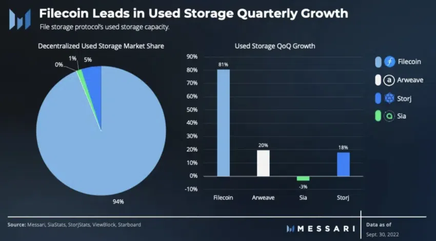 ในแง่ของการเติบโตของพื้นที่จัดเก็บข้อมูลระหว่างโปรโตคอลแบบกระจายอำนาจ Filecoin นั้นยังคงเป็นผู้นำ — โดยมีส่วนแบ่งตลาดโดยรวมในไตรมาสที่ 3 คิดเป็น 81%