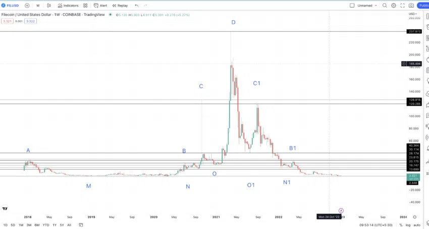 ดังนั้น เราจึงสามารถคำนวนเส้นทางจากราคาต่ำสุดของ FIL ในปี 2023 เพื่อหาจุดสูงสุดถัดไปได้ ช่วงระยะเวลาโดยเฉลี่ยทำให้จุดสูงเกิดขึ้นในปี 2023 แต่อย่างไรก็ตาม เราอาจจะพูดได้ว่าสภาพของตลาด Crypto ในปัจจุบันอาจจะเกิดการยื้ดเยื้อและไปปรากฏขึ้นในปี 2024 แทน โดยเราจะเลือกใช้ช่วงระยะเวลาที่ยาวนานที่สุดที่ 259 วัน — ซึ่งเป็นช่วงระยะเวลาที่ใช้จากจุด B1 ถึง M1 จากรูปแบบก่อนหน้านี้ — แทน