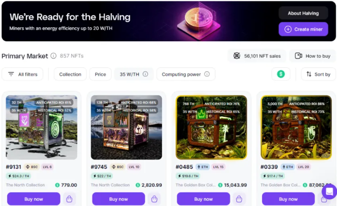 แต่ละคอลเลกชันได้รับการสนับสนุนโดยพลังการคำนวณที่เพิ่มมากขึ้นของศูนย์ข้อมูล เมื่อคุณซื้อ NFT คุณจะได้รับส่วนแบ่งพลังในการขุด ซึ่งกำลังขุด Bitcoin อย่างแข็งขัน