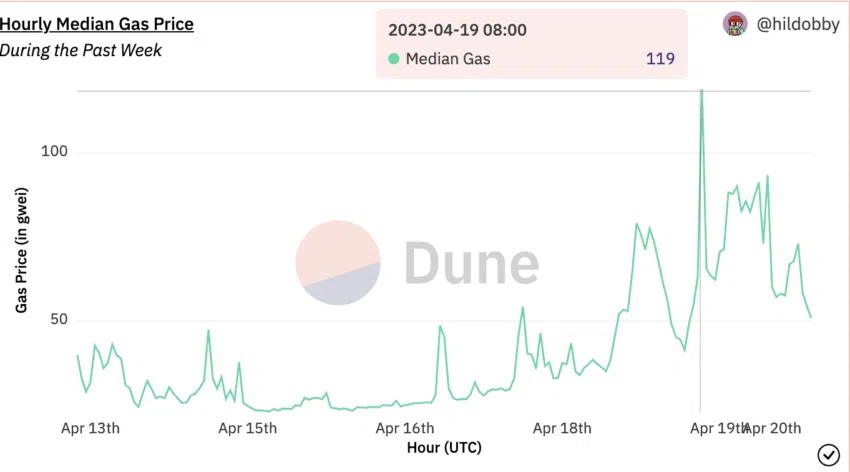 กิจกรรมของ Sandwich Bots เหล่านี้พุ่งสูงสุดในวันที่ 19 เมษายน 2022 เมื่อค่าแก๊สโดยเฉลี่ยต่อชั่วโมง ณ จุดหนึ่งพุ่งขึ้นเป็น 119 Gwei