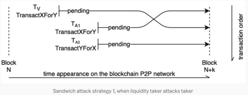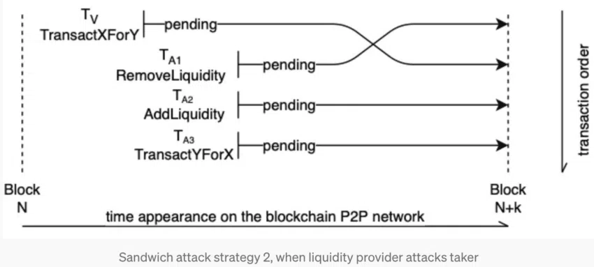 - Front-Running: ในโลก DeFi, Front-Running ก็เปรียบเสมือนการได้รับรู้ข้อมูลล่วงหน้าเพื่อทำการเทรด ผู้ที่ทำการโจมตีแบบแซนด์วิชจะใช้วิธีการนี้โดยดักจับข้อมูลเกี่ยวกับคำสั่งที่กำลังรอการดำเนินการ, MEVs, หรือแง่มุมอื่นๆ เพื่อทำการควบคุมคำสั่งการซื้อขายและทำกำไรในระหว่างนั้น