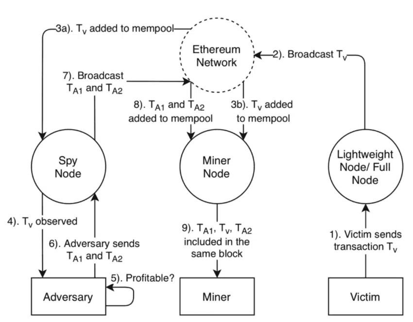 ผู้โจมตีจะพึ่งพาบอทในการสแกน Mempool เพื่อมองหาธุรกรรมที่รอการดำเนินการ พวกเขามักจะมองหาการสวอปหรือการเทรดที่มีมูลค่าสูง เมื่อพวกเขาระบุเป้าหมายได้ (ธุรกรรมที่รอการดำเนินการ) พวกเขาใช้อัลกอริธึมการเทรดความเร็วสูงเพื่อทำการ Front-Run ธุรกรรมเป้าหมายและ Back-Run คำสั่งขายเพื่อใช้ช่องโหว่จากความไม่สมดุลของตลาดหรือกลุ่มสภาพคล่องที่เกิดจากคำสั่งซื้อของพวกเขา ผู้ซื้อที่ทำการ Front-Running PEPE และ CHAD คือตัวอย่างรายล่าสุดของการนำ MEV หรือ Sandwich Bot มาใช้งาน