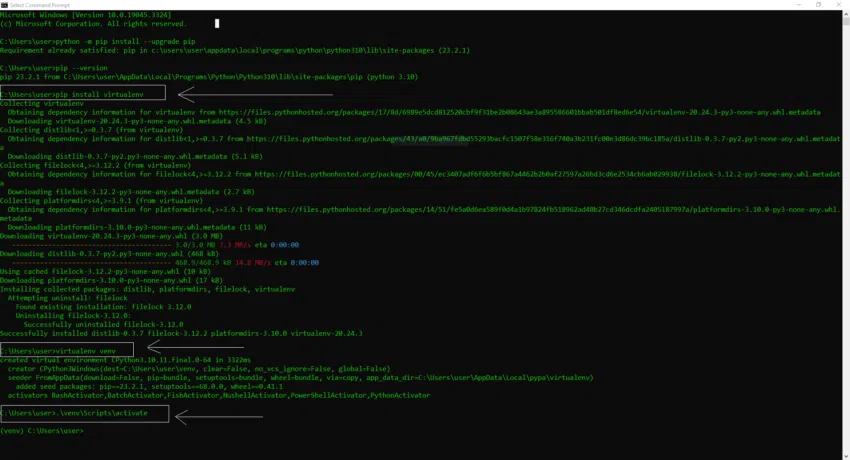 - ติดตั้งมันโดยใช้คำสั่ง: pip install virtualenv