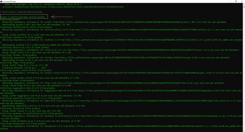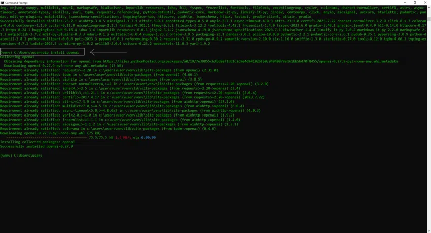 เมื่อคุณรันคำสั่งเหล่านี้แล้ว Pip จะดาวน์โหลด Library ที่จำเป็นจาก Python Package Index (PyPI) และจัดระเบียบ Library เหล่านั้นไว้ใน Python Environment ของคุณ ตอนนี้ เหลืออีกแค่ไม่กี่ขั้นตอนคุณก็จะสามารถสร้าง AI Chatbot ของคุณเองได้แล้ว