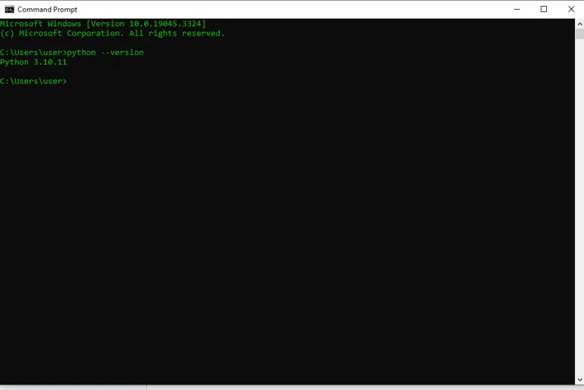 หาก Python ได้รับการติดตั้งอย่างถูกต้อง หน้าต่าง Command Prompt จะแสดงเวอร์ชั่นของ Python ที่คุณติดตั้งเอาไว้ ดังที่แสดงให้เห็นในภาพตัวอย่างด้านล่าง