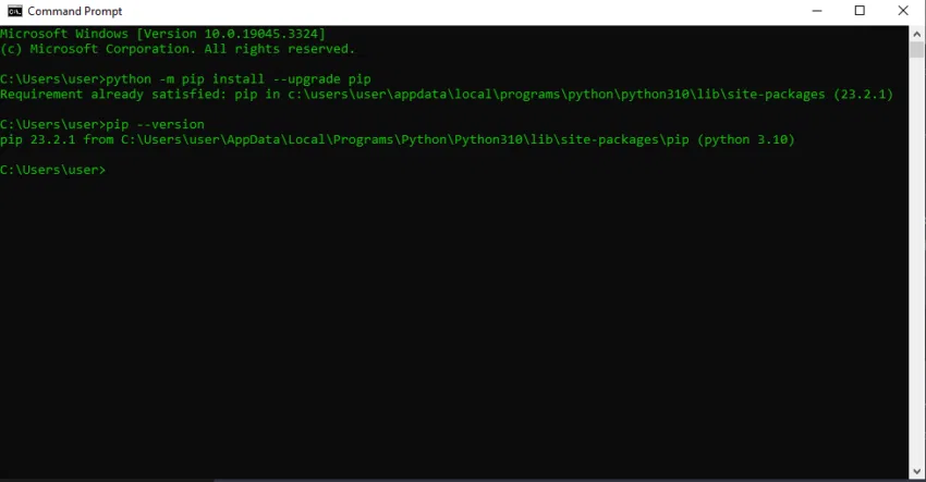 อย่างไรก็ตาม หากสามารถอัพเดตเวอร์ชั่นได้ Pip จะทำการดาวน์โหลดและติดตั้งโดยอัตโนมัติ เมื่อกระบวนการอัพเดตเสร็จสิ้นแล้ว ให้ทำการตรวจสอบอีกครั้งโดยการใช้คำสั่ง pip –version เพื่อให้แน่ใจว่าการอัพเดตประสบความสำเร็จ